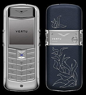 Модель ; Vertu Constellation Vivre Ocean Blue. Полированная нержавеющая сталь, кожа цвета океанской волны с вышивкой
